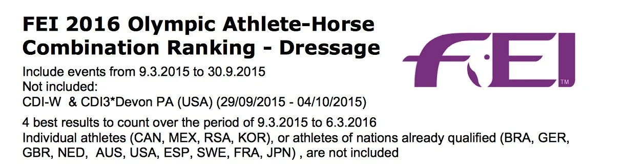 Ekvipagerne har frem til 6. marts 2016 for at samle bedst mulige score ud af i alt 4 scorer. Og hvis 3 danske ryttere kvalificerer sig individuelt er holdet klar. De individuelle pladser uddeles dels med 12 fra de forskellige verdensdele (se evt. tidligere nyhed om OL) samt yderligere de 6 bedst placerede via ranking.