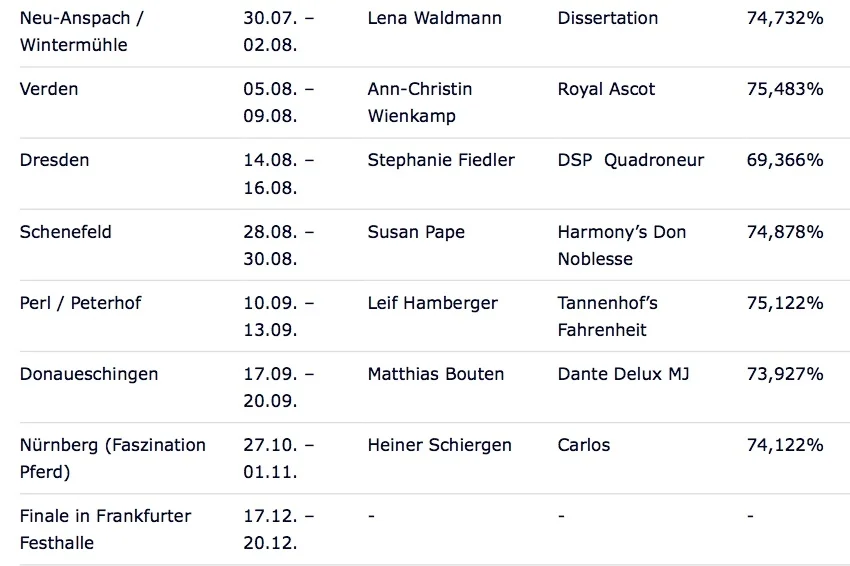 Det bliver en finale med Isabell Werth isæt. Selv er hun kvalificeret med en hest, derudover er hendes rytter Beatrice Buchwald kvalificeret med en hest, og hendes tidligere rytter Matthias Bouten er kvalificeret med to heste.