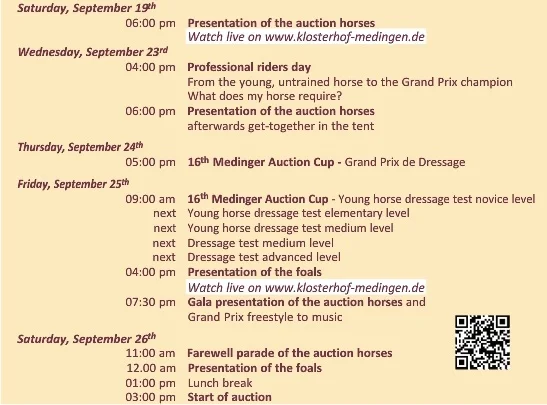 Nederst her finder du ugen program på Klosterhof Medingen med bl.a. tider for livestreaming fra både rideheste kollektionen og føl kollektionen.