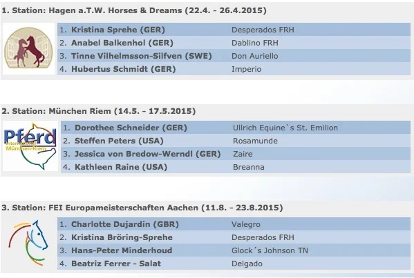 I finalen som går i Dortmund i marts måned næste år er nedenstående ekvipager allerede kvalificeret. Der følger kvalifikation i Oldenburg i november og Münster i januar.