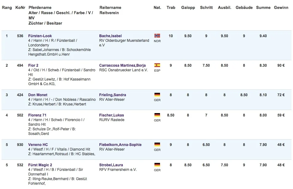 Fra at den unge 3 års Fürsten-Look skridtede med meget store og momentvis ubalancerede skridt, har han nu som 4 års fået styrken til at bevare både marcherede energiske skridt samt helt klar takt, uanset om han går for let anstillet tøjle eller lang tøjle. En "øvelse" som man uden tvivl må give Isabel Bache den fulde kredit for, og som formodentlig også kan bringes med i den videre uddannelse med samme høje kvalitet.
