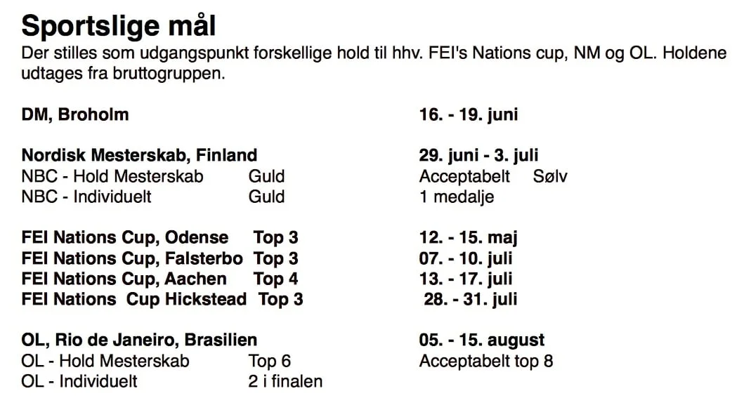 "Vi bygger en bruttotrup op frem mod mesterskaberne og ud fra denne sættes der landshold til henholdsvis Nordisk og OL samt til de øvrige CDIO stævner. Med mindre andet er aftalt, skal man ride med ved DM på Broholm, for at være i betragtning til A landsholdet."