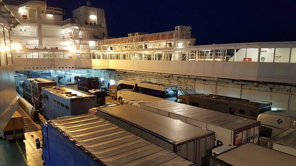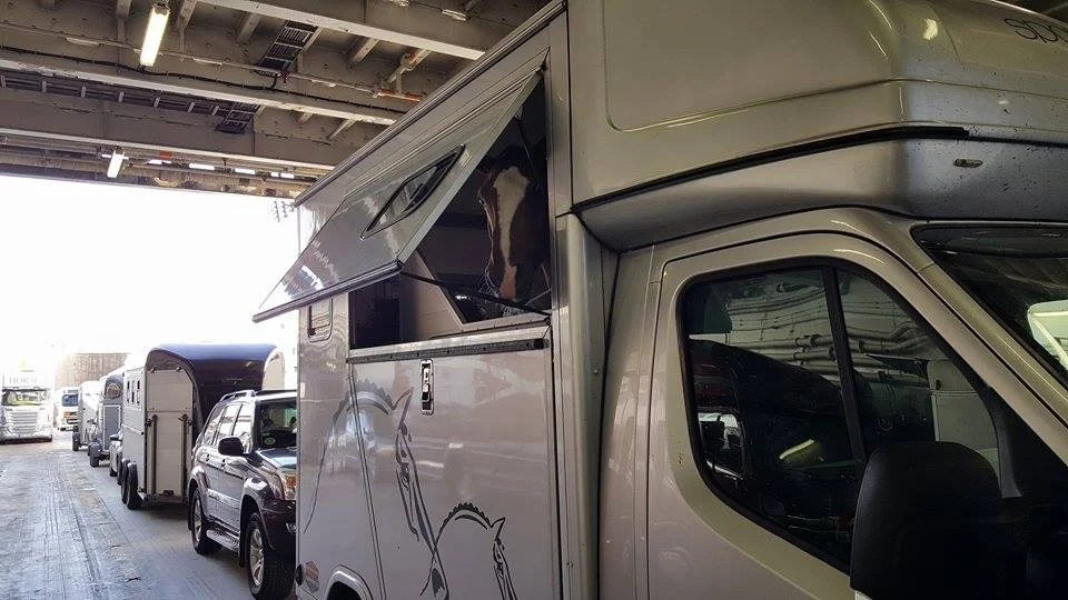Her ventede ca. 20 hestetransportere på at komme med. Det var helt vildt. Sejlturen forløb uden problemer, og vi havde lavet en boks i vores transport så Eno kunne placere sig som han ville. Han var super nem at rejse så langt med.
