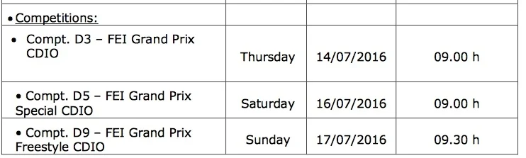 Bemærk at man i år afvikler hele CDIO5 Grand Prix team konkurrence om torsdagen, og herefter er de 6 bedste teams er kvalificeret til lørdagens Grand Prix Special team konkurrence, samt de 6 bedst individuelt placerede fra Grand Prix klassen. Team konkurrencen er først afgjort efter lørdagens Grand Prix Special.