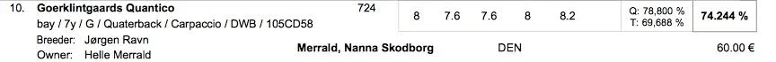 Gørklintgårds Quantico med Nanna Merrald leverede en flot tur. Selvom Quantico ser ud til at være lidt opstemt rundt om banen, så har Nanna kontrol over situationen inden på banen, hvor hun rider flot til i travturen. God skridt. Lidt ubalance i den 2. halvpirouette og en lille fejl i 4´er serien.