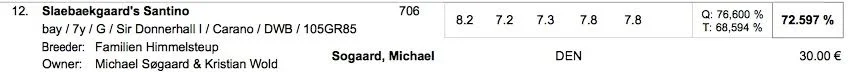 Slæbækgård´s Santino og Michael Søgaard viser en teknisk flot tur, med flot udtryk, sving og bæring i travturen. God skridttur. Sikker galop tur, hvor man godt kunne ønske sig lidt mere spring af jorden men teknisk uden fejl.