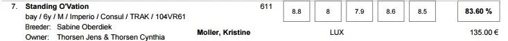 Med direkte i finalen er også danske Kristine Møller (som nu rider for Luxembourg) sammen med den smidigt gående Standing O´vation. Super go og flow i versader og traversader. Umiddelbart lidt under bedømt i en super god skridt, så her må der klart være mulighed for et par hak op på pointtavlen. Rigtig flotte changementer selvom selve grund galopkvaliteten måske ikke umiddelbart indbyder til det.