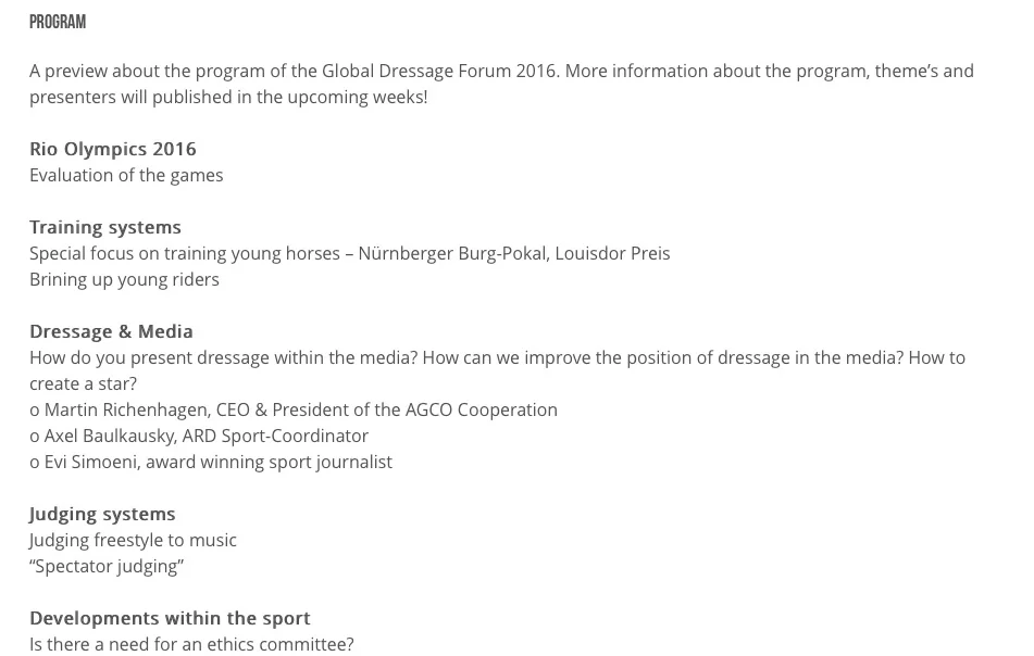 Det foreløbige program for årets Global Dressage Forum er klar. 2016 udgaven afholdes på Hof Kasselmann i Hagen.