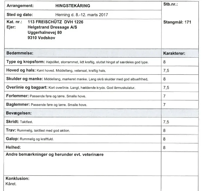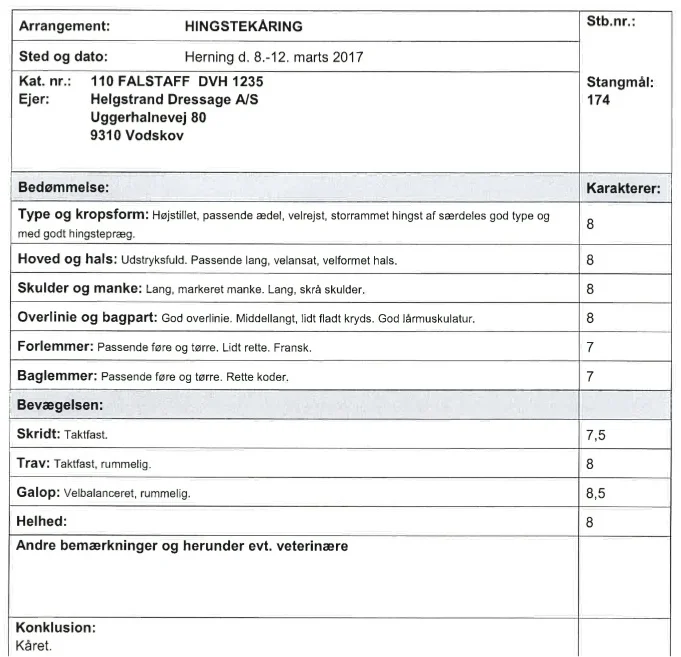 Charlotte Mogensen March 14, 2017 Bedømmelsesrapporter på nye godkendte hingste inkl. karakterer Charlotte Mogensen March 14, 2017 Se linket til de 3 års hingste her. 4 års hingste endelig kåret 5 års og ældre hingste kåret