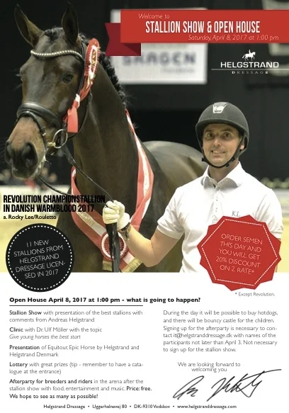 Charlotte Mogensen March 25, 2017 Open House & Stallion Show at Helgstrand Dressage April 8 at 1.00 pm (live stream via Clipmyhorse) Charlotte Mogensen March 25, 2017