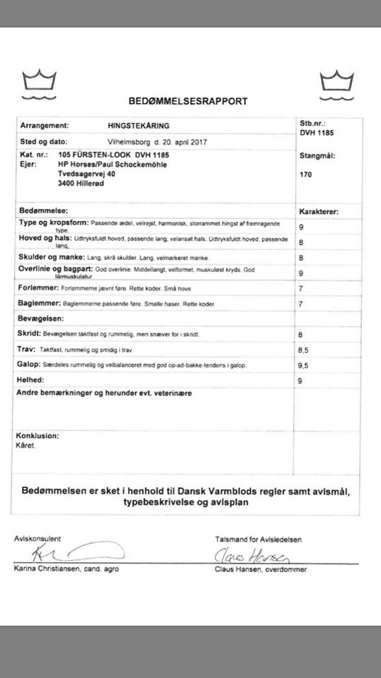 Fürsten-Look var desværre ikke klar til den endelige kåring i Dansk Varmblod til hingstekåringen i marts, istedet mødte han sammen med sin daglige ryttet norske Isabel Freese til efterkåringen på Vilhelmsborg igår og blev endelig kåret. Se et lille klip af præsentationen fra Vilhelmsborg og samtidig de flotte slut karakterer.