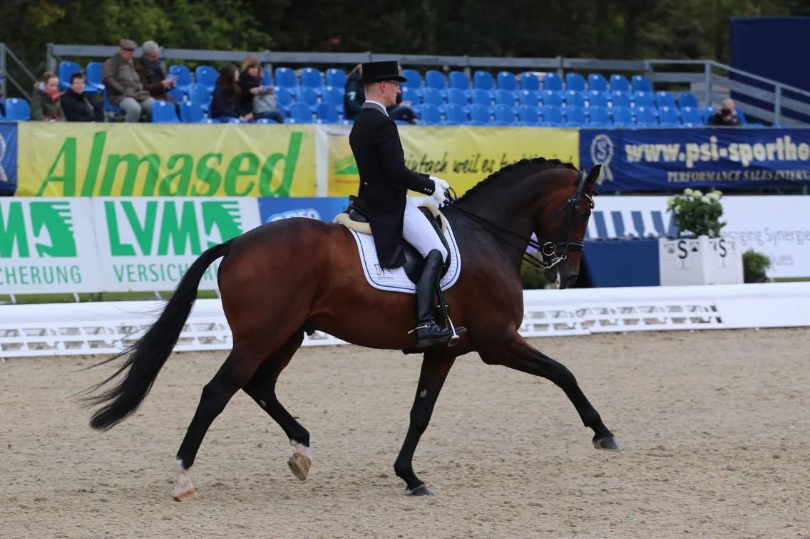 Blue Hors Veneziano and Daniel Bachmann were ready again in today's Intermediate I. The overall picture is a calm and harmonious image, although the difficulty of the Inter I test becomes a bit of a mouthful for the just 7 year stallion.