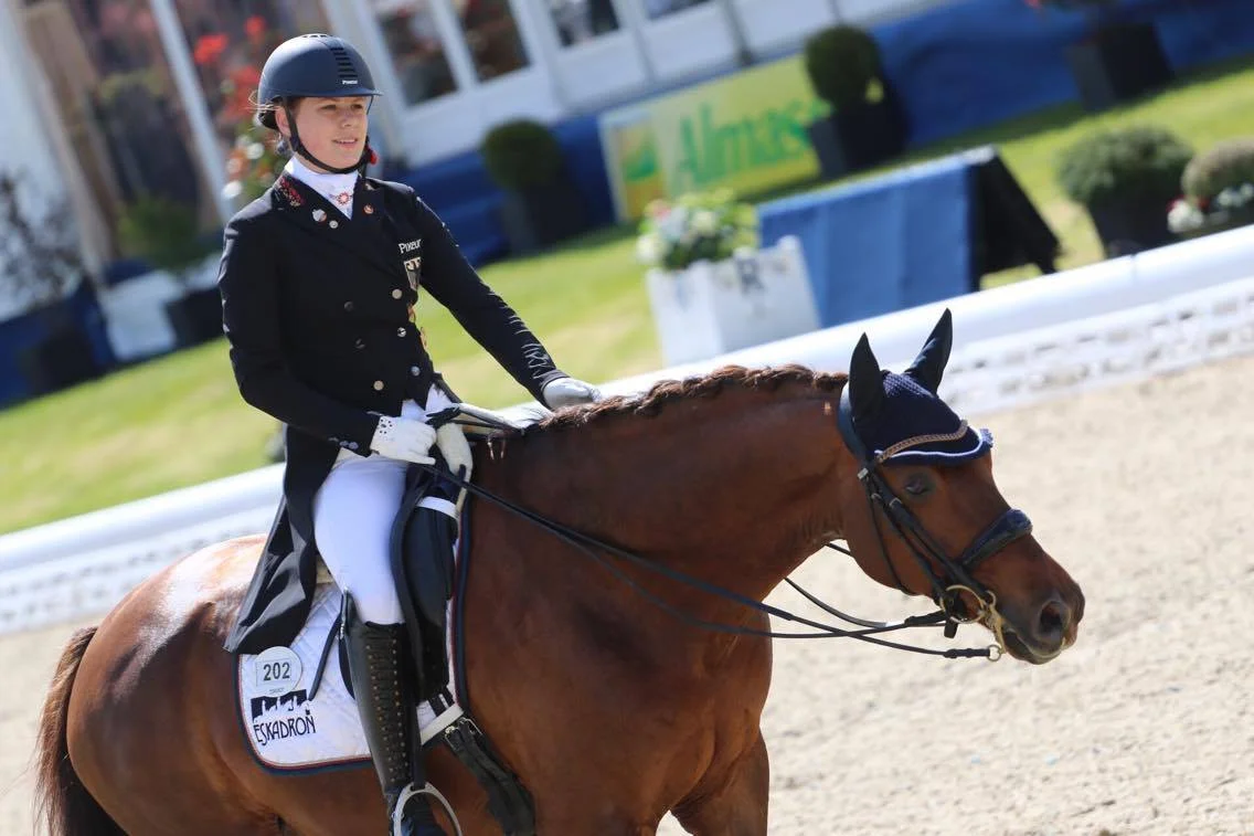 Even though today's winner, German Jil-Marielle Becks and Damon's Satelite did not show the same great smooth test as in Prix Sct. Georg class on Thursday, the basic qualities are just outstanding. At the entering halt you could feel a bit of resistance, but Jil rides fresh forward, eventhough the first diagonal with medium trot Satelite becomes slight unstable in the contact. Floating and super natural power with lovely carriage for shoulder in / volte / half passes exercises. In the transition to collected walk, Satelite stops completely and it looks for a short moment a bit difficult for Jil to get Satelite focus on her. But not with any actual nominal value reduction in the marks of the exercise, which also relates to a super good collected walk - for this Intermediaire test a seperate mark for the transition would make real sense. Superb extended walk. Small error by the 3 times series, which unfortunately was not seen by either judge at C or judge at M.