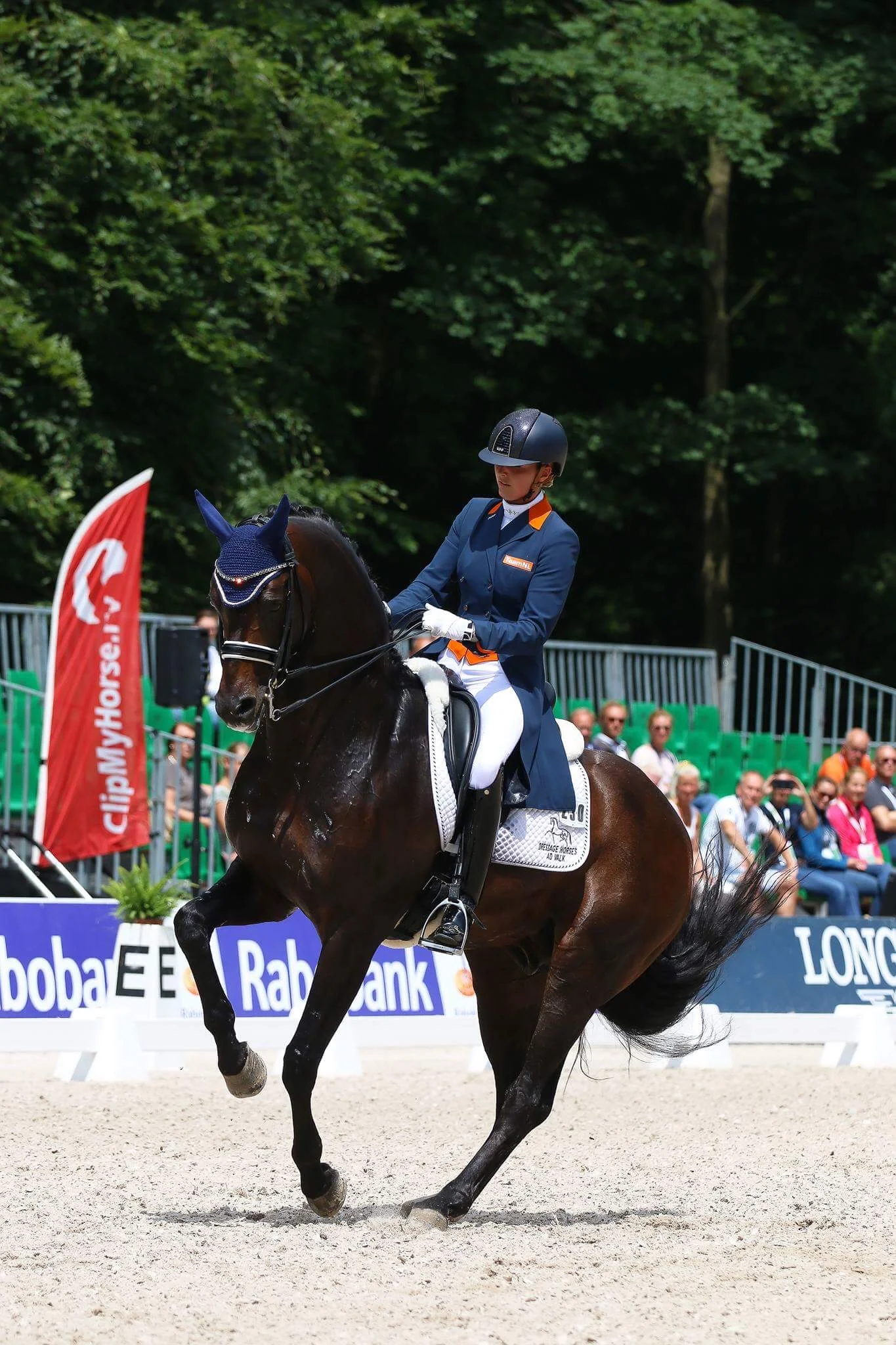 12 yr old KWPN stallion Apache and Emmelie Scholtens has not been competing since January at Amsterdam. Fully concentrated and top harmony between horse and rider all the way. No technical issues, but very balanced and well timed all the way. The first piaffe becomes a bit cautious, while the next two are with more activity. Super nice series and well performed pirouettes with high quality. And it really looked like as if Apache also was totally in the zone, while he afterwards as usual shows around and making some noise. Lovely to see them back and right now a serious couple for the Europeans in Gothenburg mid August.