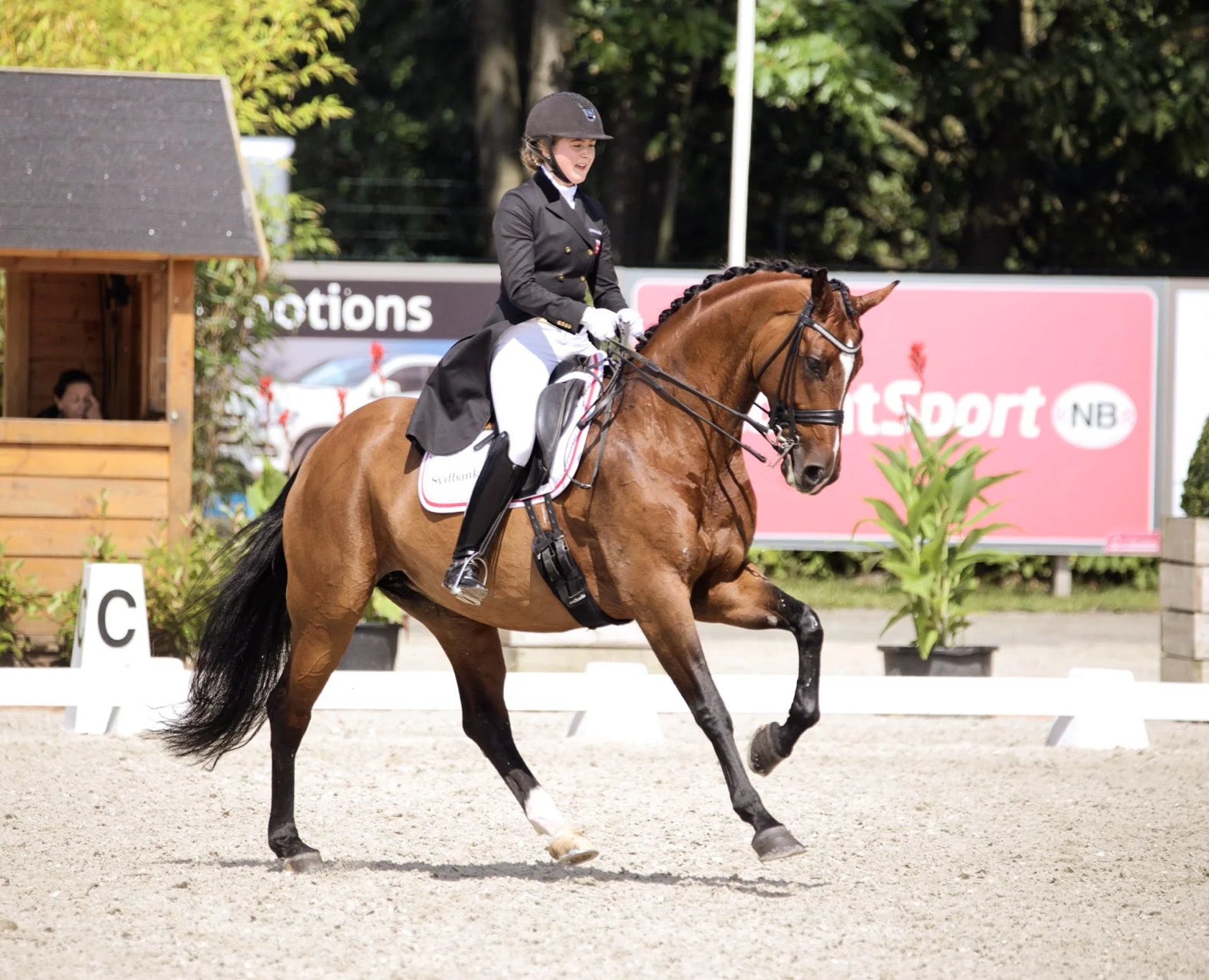 Den velgående hoppe Noosa Melody er tilbage i super form efter et længere fravær pga. en infektion. Karoline rider et super flot program med masser af positiv power og god balance. Eneste lille ting er den svære overgang fra galop ad midten gennem skridt, hvor Noosa kommer lidt bagom hjælpen, ellers en flydende og skarp tur, som ved dagens afslutning har bragt dem på en foreløbig 4. plads med 71,763%, som ligner en ret sikker plads i kür finalen på søndag, hvor de 18 bedste ekvipager går videre til.