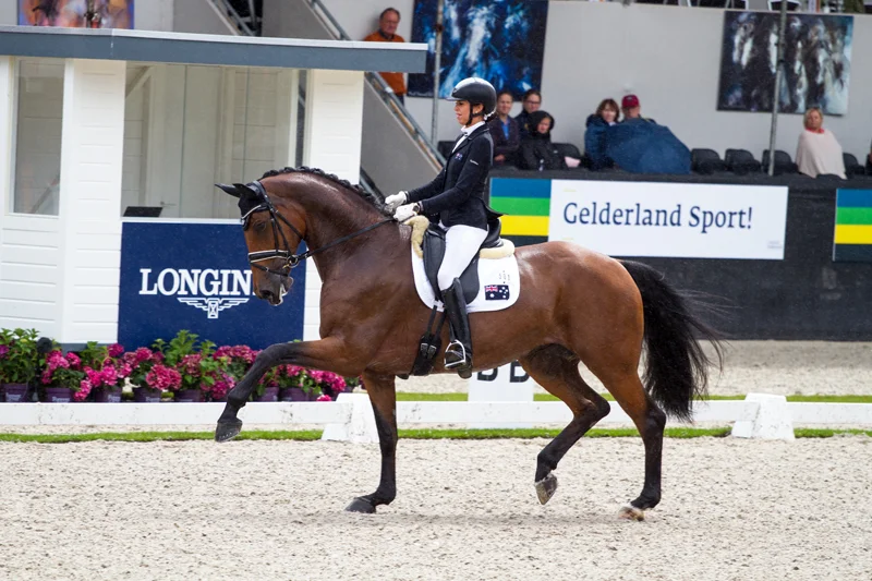 3rd Australian Simone Pearce (Helgstrand Dressage) showing the bigframed mare Casablanca. Casablanca enters the arena with a bit big eyes, but Simone really manage well. Lots of expression and power for the entire trot tour = 10 for the trot from the judges. Bit tense for halt and rein back, good walk, and good canter although Casabalanca looks a tense in the topline.