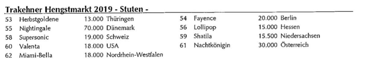 Charlotte Mogensen November 13, 2019 Results from Trakehner licensing and auction Charlotte Mogensen November 13, 2019 Champion stallion 2019 - Ferrari Forever Full list of licensed stallions here.Auction results: