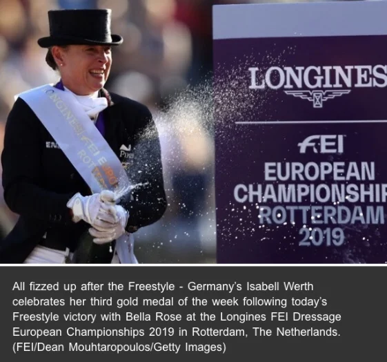 This has been a great week and a very long week and I’m so happy and so proud of Bella!” said Werth. “She gave me a super feeling in all three competitions, and she was always doing her best.