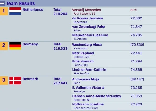 Eftermiddagens U25 team konkurrence blev lidt mere end almindelig spændende, og i sidste ende var det ikke præstationerne på banen så afgjorde tingene, men derimod i dommerburet, helt præcist ved den ungarske dommer B som så sidste danske ekvipage Josefine Hoffmann med Hønnerups Driver til sølle 65%, ihvertfald når man ser hans kollegaers bedømmelser som lød på 75%, 72%, 76% og 72%, præcist i dag betød det faktum at Danmark mistede sølvmedaljen.