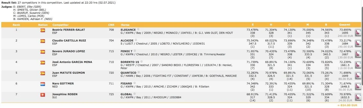 The announcement of the Spanish team for the Olympics has not been published yet from team trainer Rudolph Zeilinger, but a closer look into the latest results, current form and experience shows a clear picture of top 3 from the Grand Prix yesterday at Grote-Brogel in Belgium, with Beatrice Ferrer-Salat, Claudio Castilla Ruiz and Severo Jurado Lopez and then it may look like a reserve spot for either Jose Garcia Mena or Juan Matute jr.