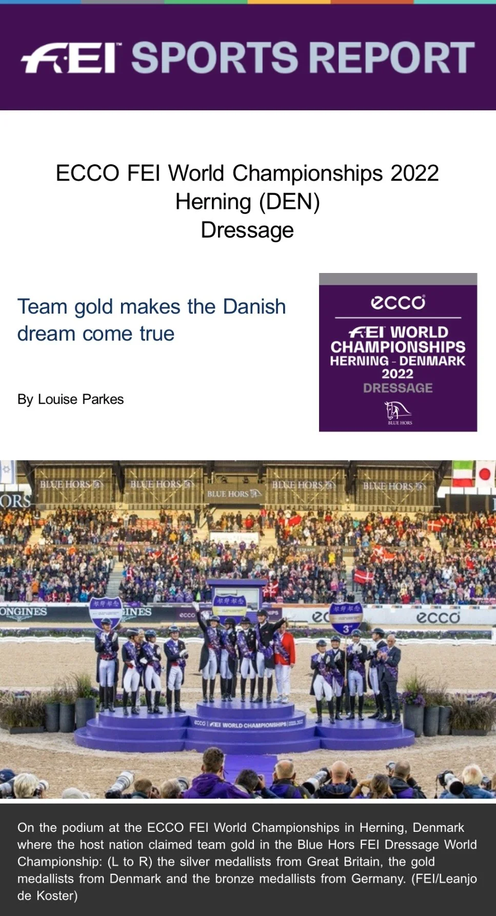The only time Denmark has ever placed on the Dressage World Championship podium was back in 1982 in Lausanne (SUI) when Anne Grethe Jensen (Marzog), Tove jorck-Jorckston (Lazuly and Finn Sakso-Larsen (Coq d’Or) clinched bronze.