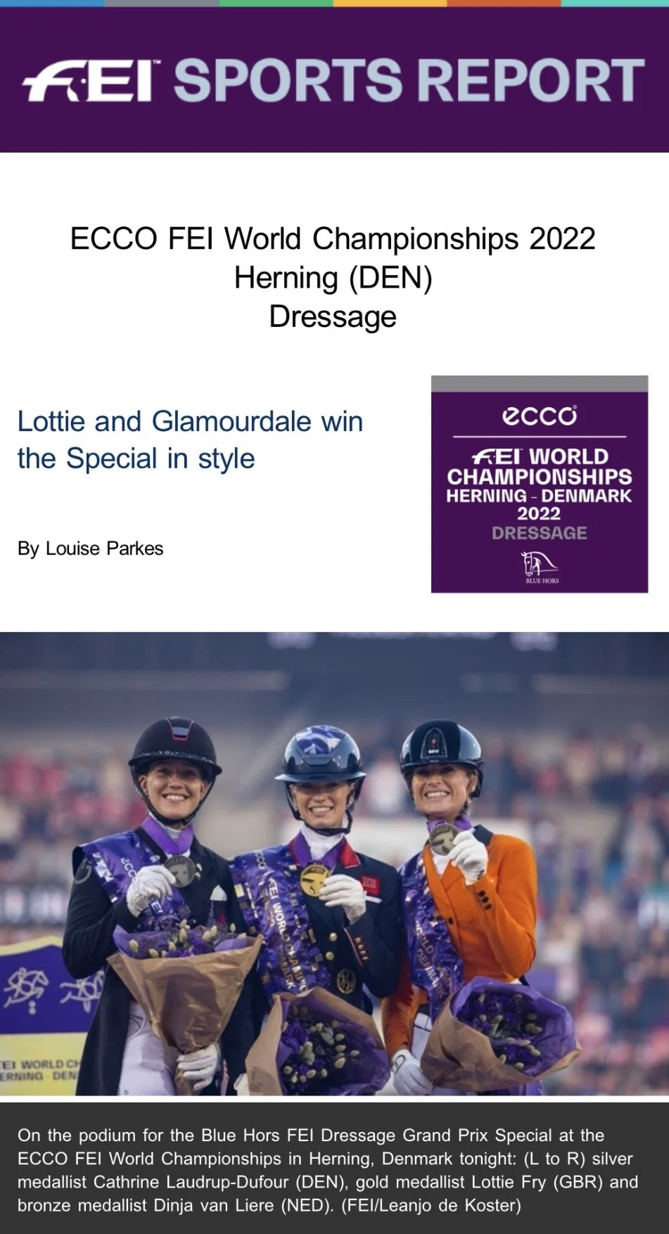 Great Britain’s Lottie Fry was the golden girl at the ECCO FEI World Championships 2022 in Herning, Denmark tonight when taking Grand Prix Special gold with the gorgeous stallion Glamourdale. On a night when the final four riders brought something very special to the ring it was host-nation superstar Cathrine Dufour who claimed silver medal spot ahead The Netherlands’ Dinja van Liere and Hermes.