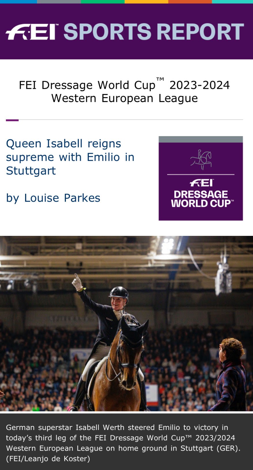 With all the authority that she carries as the most consistently successful athlete in the sport of Dressage, Germany’s Isabell Werth strutted to victory with Emilio at the third leg of the FEI Dressage World Cup™ 2023/2024 Western European League in Stuttgart (GER) tonight.