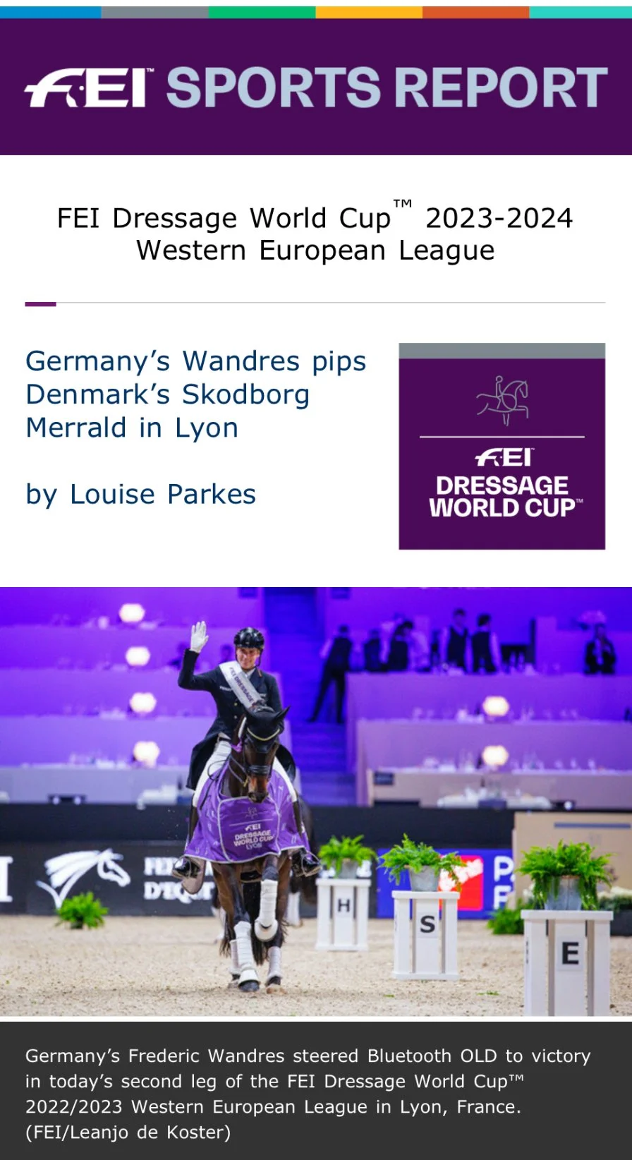 Germany's Frederic Wandres steered Bluetooth OLD to victory in today’s second leg of the FEI Dressage World Cup™ 2022/2023 Western European League in Lyon, France where Denmark’s Nanna Skodborg Merrald and Blue Hors St Schufro finished second head of Pauline Basquin and Sertorius de Rima Z IFCE from France in third.