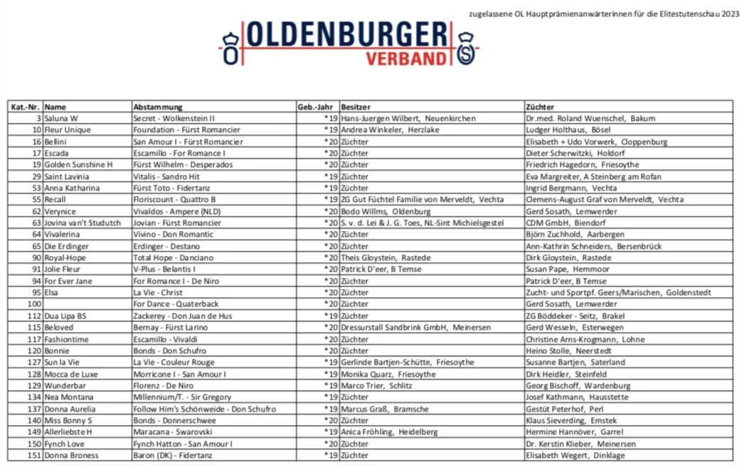 So far only two stallions La Vie (qualified for Nürnberger Burg-Pokal final) and Escamillo are represented with two mares for the Elite mare show in Rastede, the rest are all with one single mare.