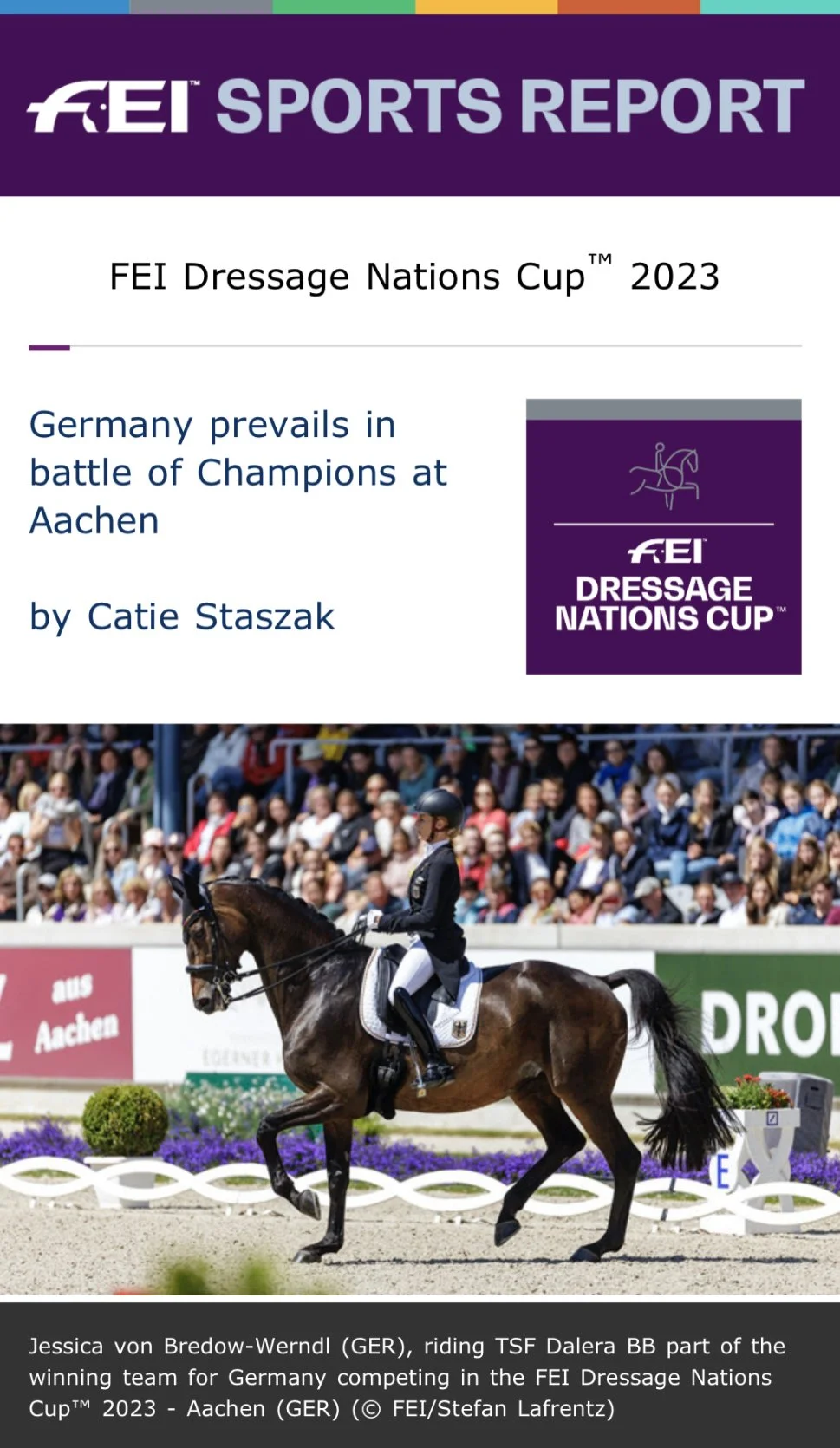 The podium looked nearly identical in the FEI Grand Prix and Grand Prix Special as Germany, Denmark and Great Britain battled for top honors in the FEI Dressage Nations Cup™ at Aachen (GER), and as the start list reached its end in the Special, only the top two athletes in the FEI Dressage World Ranking remained—Jessica von Bredow-Werndl (GER) and Charlotte Fry (GBR).