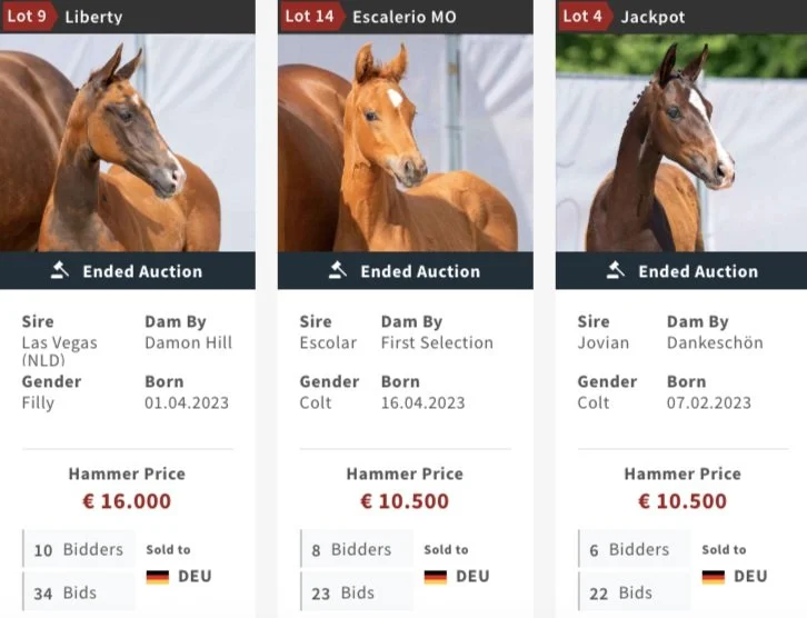 Charlotte Mogensen July 3, 2023 16.000 euro top price filly by Las Vegas / Damon Hill at 66th Westphalian Online foal auction Charlotte Mogensen July 3, 2023 25 foal under the hammer - only 3 sold for over 10.000 euro Here you find the entire results.
