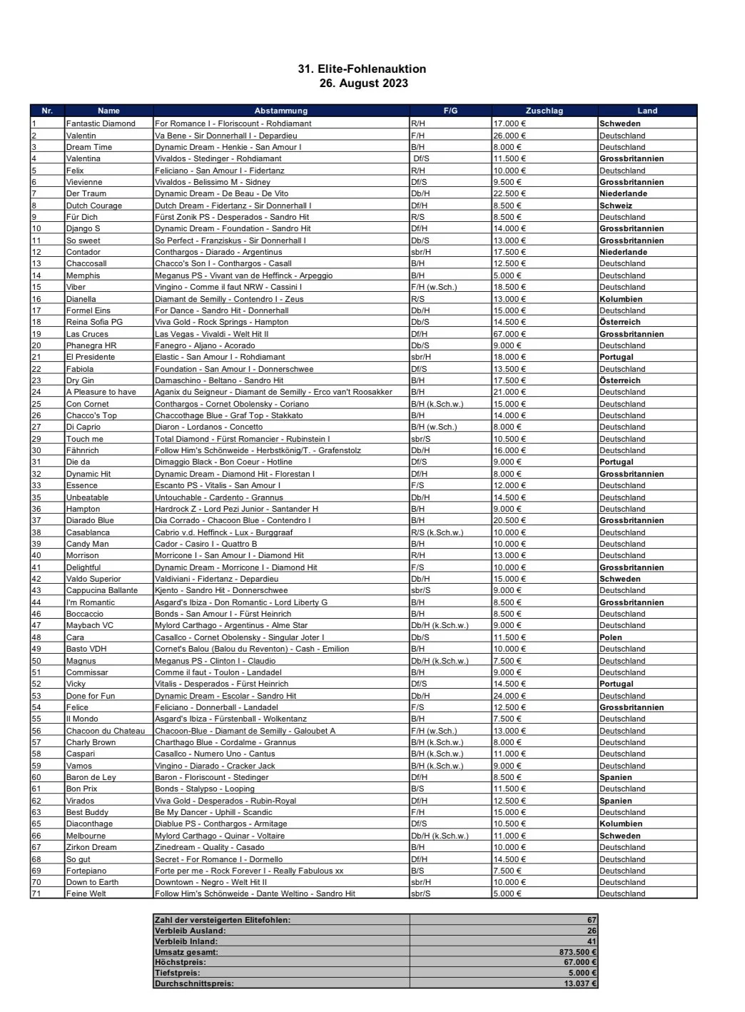 Oldenburg elite foals are in great demand worldwide – the Brits especially were in a buying mood and secured no less than ten Oldenburg youngsters at the 31st Elite Foal Auction at the Oldenburg Horse Center in Vechta. On average, Oldenburg fans paid 13,000 euros for their Oldenburg young talent. More than a third of the auction foals were knocked down to Oldenburg friends around the globe.