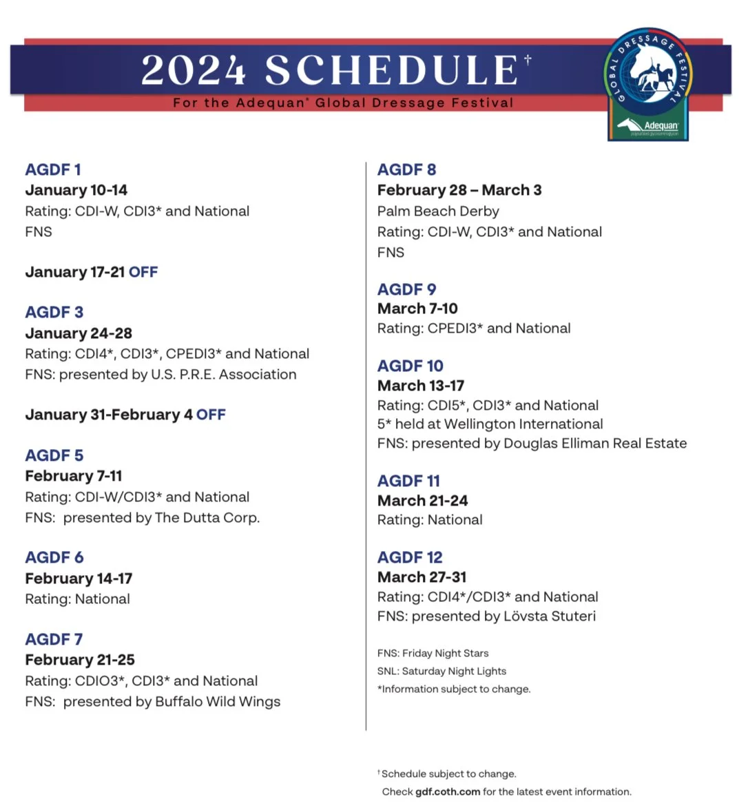 🏆 A Season of Olympic Ambitions: Dressage and Para Dressage riders from around the globe are flocking to Wellington with Olympic dreams in their eyes. Their goal? To don their nations' colors at the 2024 Paris Olympics and Paralympics. Our jam-packed calendar features three World Cup Qualifying events, two CDI4* weeks, and the dazzling five-star event sponsored by Douglas Elliman at Wellington International's International Arena. With the inclusion of the FEI Nations Cup Series CDIO3* and the two CPEDI3* Para Dressage events, we proudly present the most expansive circuit of Dressage the world has to offer.
