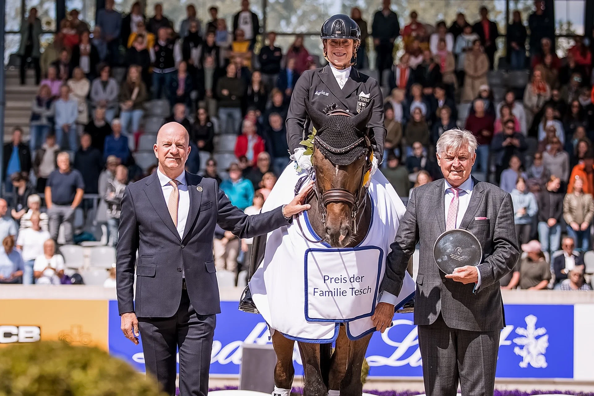 Isabell Werth has been riding the ten-year-old Danish mare, Wendy de Fontaine, since the start of the year. They came together very quickly. So fast that they are considered to be potential candidates for the Olympic Games and the selection committee used the Prize of Family Tesch as a final opportunity of direct comparison between her and other five-star pairs before they select their team for Paris. That is why Wendy was nominated for the team instead of Quantaz. They were the best German pair in the class and already put in a performance in the first quarter of the test that hardly any other pair was able to beat. On a score of 76.50 percent they claimed their first Grand Prix victory in Aachen and thus also won the Prize of Family Tesch.