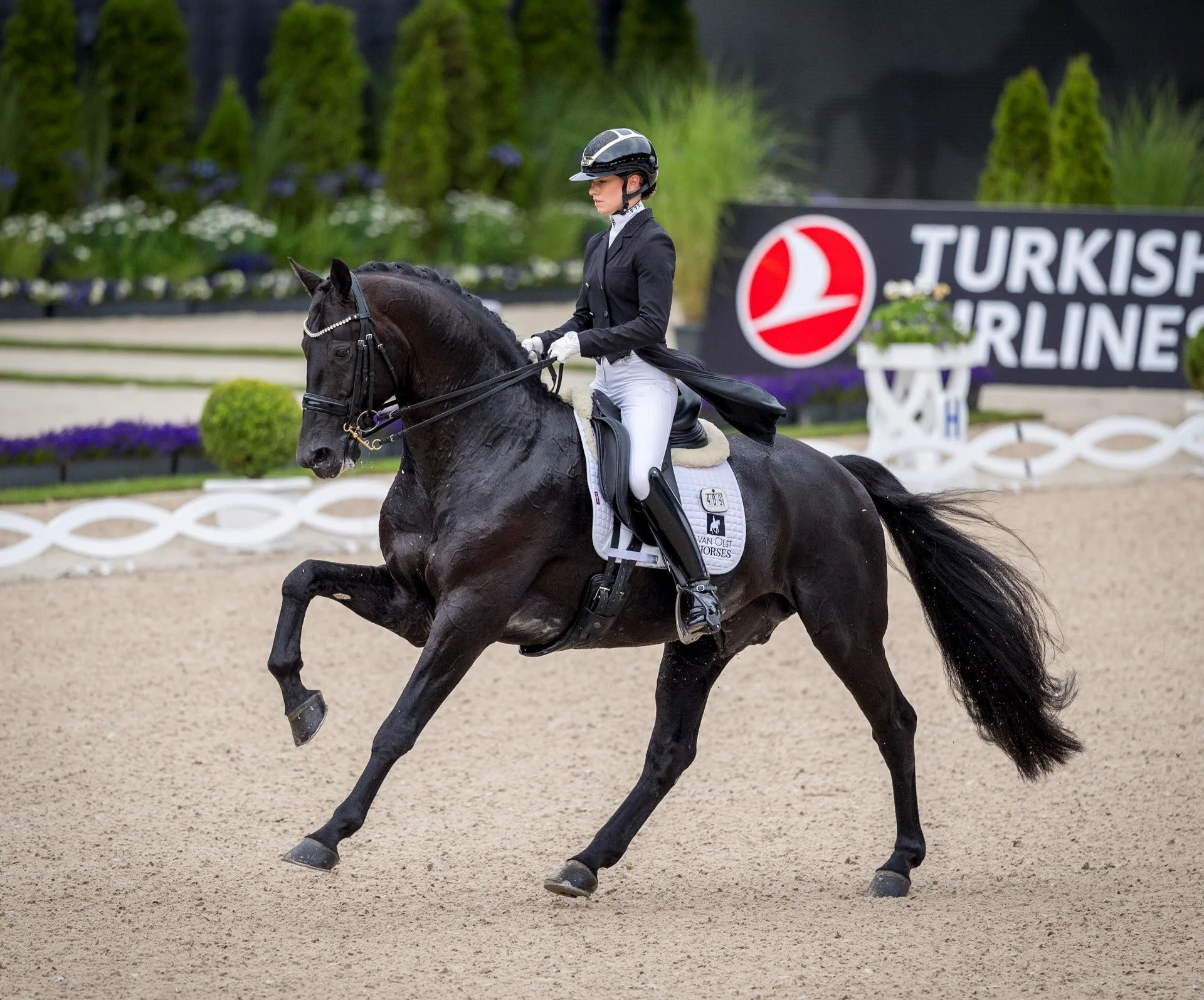 The performance of Fry and Glamourdale was full of wow effects – even if she did make some expensive mistakes in the pirouette to the right. First of all, Glamourdale did a flying change, then he lost his balance in the pirouette. But then Fry had everything under control again. The murmurs of the spectators until then and the compassionate groans when it happened, said it all: It was a performance that didn’t leave anyone cold. “To be honest, that was one of the best feelings that he has ever given me in a test,” beamed Charlotte “Lottie” Fry. She had a plausible explanation for the error: “I was so pleased with my pirouette to the left that I somehow forgot to ride the rest of the centre line. So, it was my own fault. But in the remaining parts of the test he was so focused on me, had so much go and so much fun in there. That was the best feeling I could have wished for before Paris.” Paris – here Fry was referring to the Olympic Games. Fry and Glamourdale have already been nominated for the British team.