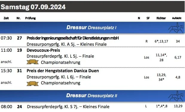 Charlotte Mogensen September 4, 2024 Bundeschampionate 2024 also starts today with 5 yr old qualifier Charlotte Mogensen September 4, 2024 Here you can find link for start and results. Running scores for 5 yr old qualifier here. The entire event is available at Clipmyhorse. Dressage schedule: