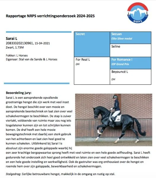 Sarai L is an attractive, striking large-framed stallion who does his work with great dedication. The stallion has a beautiful and appealing leg technique and shows that he has a lot of ability to change tempo and candence. The walk is clear, four-beat, sufficient of space but could be a bit more suppleness with more over track. The trot has a very beautiful movement technique with a strong use of the hind leg and shows that he can easy switch in tempo and candence. What stands out in Sarai L is absolutely his big outstanding canter in which he has a very powerful uphill jump with a lot of space and a very good self-carriage.