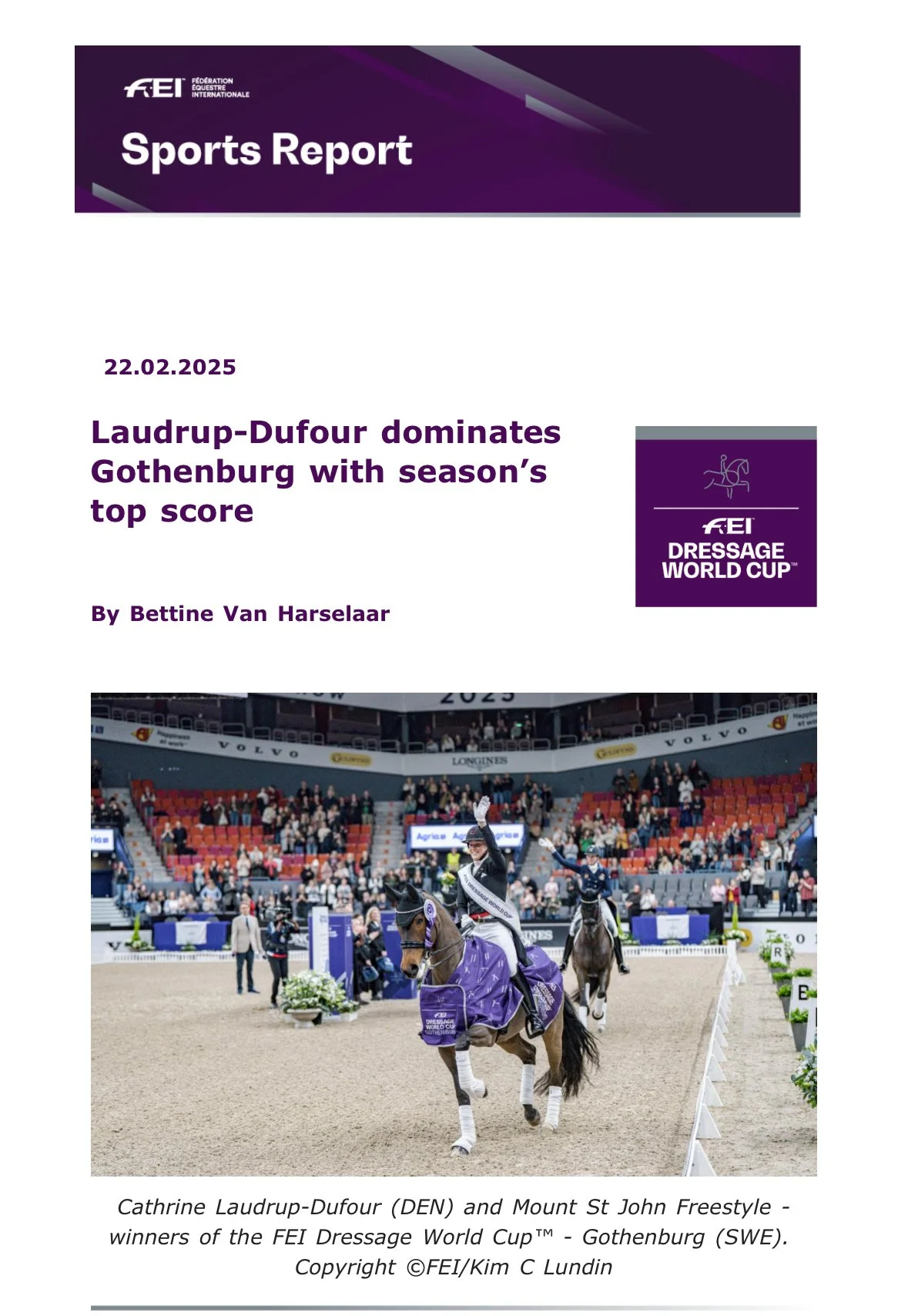 With an outstanding score of 91.140%, Cathrine Laudrup-Dufour (DEN) and the highly talented Mount St John Freestyle delivered the highest mark of this FEI Dressage World Cup™ season so far. Their brilliant ride secured an overwhelming victory in Gothenburg, in the vast Scandinavium arena. The entire top three achieved personal bests, with Maria von Essen (SWE) claiming second place on home soil with Invoice, and Corentin Pottier (FRA) taking third with Gotilas Du Feuillard.