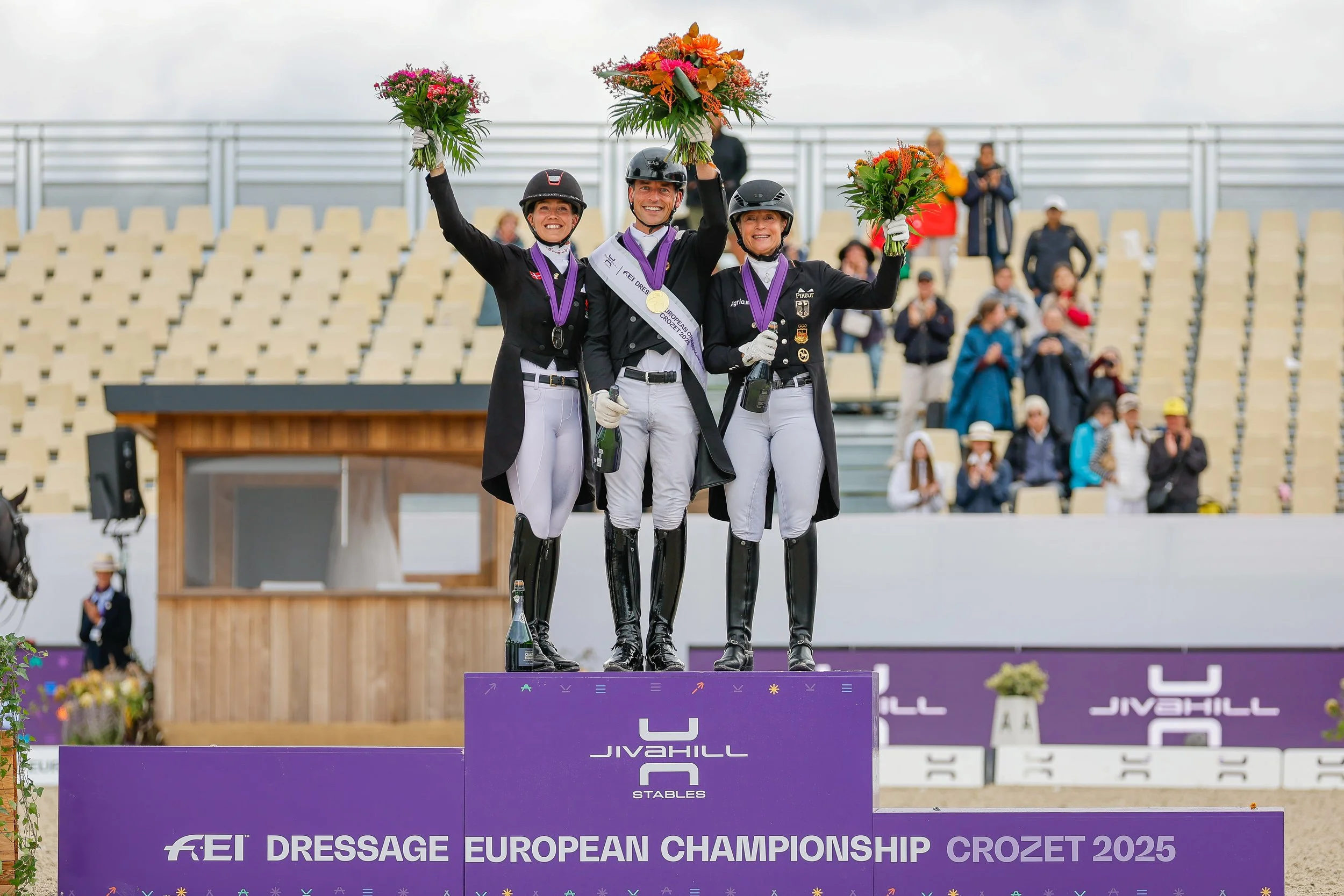 Isabell Werth, 2025 European Bronze Medalist with Wendy de Fontaine "I’m sorry, I’m not part of the young generation! But anyway, I did my best to defend my position today! I’m really happy with Wendy de Fontaine. I expected it to be an easy competition today. In reality, it was very close and tough, which made it really exciting for all of us. And of course, when you’re here, it’s about giving your best and trying to win. I expected great performances from Justin and Cathrine, of course. So for us, it was important to go into the arena and give everything. I lost a bit of energy in the transitions. I did my best. I’m not yet at the level I’d like or should be at right now, because we started a bit late in the season due to a small injury. That made the path to peak form more difficult. Nevertheless, Wendy de Fontaine did many good things, and I was really happy with her passage and piaffe work."