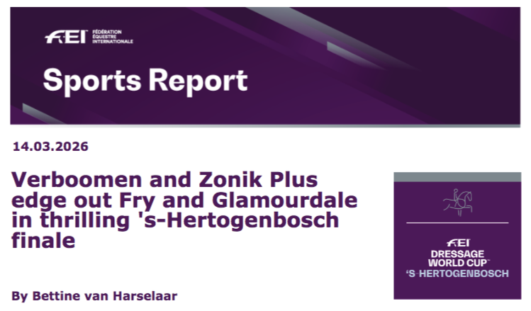 The final qualifier of the FEI Dressage World Cup Western European League in ‘s-Hertogenbosch (NED) turned into a direct duel between the world numbers one and three: Justin Verboomen (BEL) and Charlotte Fry (GBR). In the end it was Verboomen with Zonik Plus who came out on top, while Fry and Glamourdale had to settle for second place. Home favourite Marieke van der Putten (NED) finished third with Zantana OLD RS2.