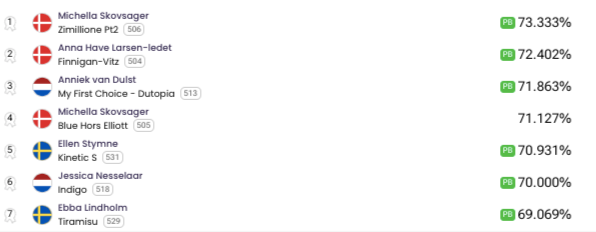 Lea Torabi og Jivago de Massa viste også en rigtig god tur, også med personlige bedste og slutter som nr. 3 med 68,676%.