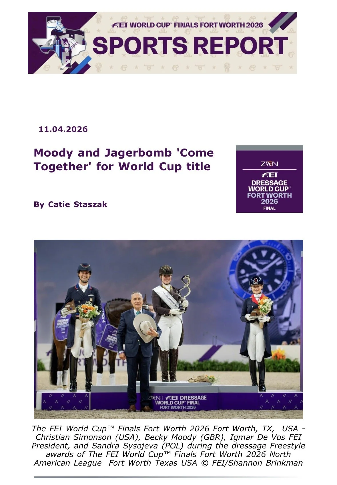 For Becky Moody, the Zen Elite FEI Dressage World Cup™ Finals in Fort Worth, Texas (USA) gave her a week of "firsts." She competed in her first North American competition. Her horse Jagerbomb took his first transcontinental flight. And in her World Cup Finals debut, first was where she ultimately finished.