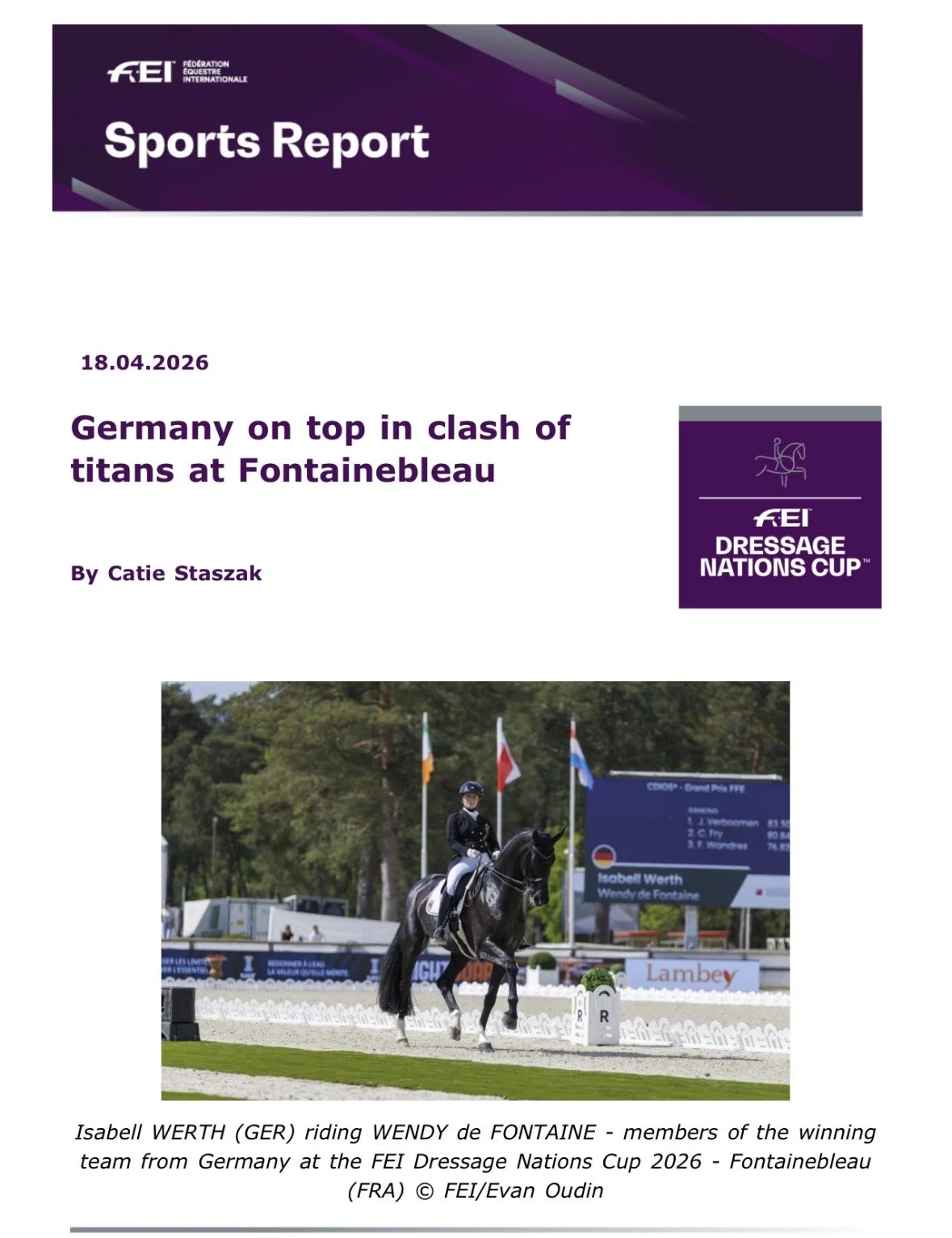 In what could have passed for a championship lineup, the FEI Dressage Nations Cup™ of Fontainebleau (FRA) came down to the wire Saturday at Le Grand Parquet. Deciding the result in the final ride, eight-time Olympic gold medalist Isabell Werth (GER) clinched a victory for Germany, which secured its second straight podium to take a decisive hold of the series standings.