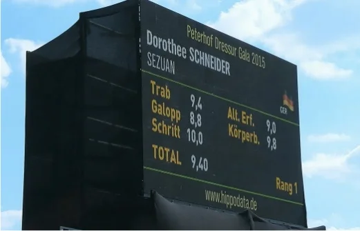 Vallakken Quel Filou e. Quaterback/Stedinger kommer med en helt frisk bronzemedalje fra Bundeschampionatet hvor Eva Möller red ham. I dag blev han redet til sejr af Sascha Schulz med en samlet score på 9,0. Placeret som nr. 2 er Helgstrand Dressage / Gestüt Peterhof hingsten D´avie 8,4 med Hannah Milena Rother i sadlen. En nydelig præsentation af den smukke og velgående hingst. I dagens anledning havde Dorothee Schneider taget tjansen som hestepasser, og stod klar til den sidste finpudsning inden hingsten skulle præsenteres for dommerne ved hånd.