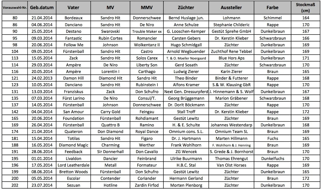 Hingsten Franziskus var tilmeldt med 12 afkom. Generelt flotte hingste med flot front og elegante kropspartier. Umiddelbart ser hverken skridten eller galoppen ud til at være i høj kvalitet. 4 udtagne hingste, heraf 1 reserve.